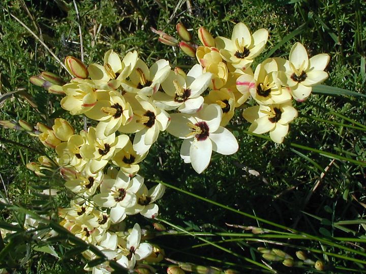 イクシア属は、約45種からなり、野生、 栽培いずれの場合も容易に交雑するため同定することが難しい。 交雑が容易なことから多くの園芸品種も作り出されている。 [ 引用 : 園芸植物大事典 ( 塚本洋太郎総監修:小学館発行 ) ] 一・二枚目の画像は花弁が黄色で中心が黒色をしていることから、 園芸品種の Ixia 'Uranus' (イクシア(園芸品種)ウラヌス)の可能性が高い。