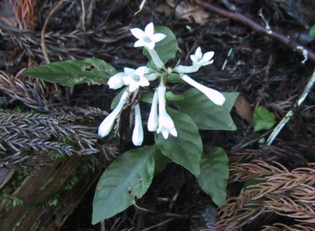 ています。花冠が長く、筒形で先が5裂した白花を一方にかたよって