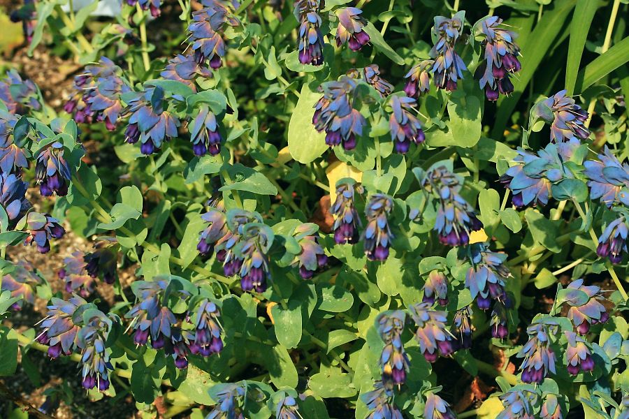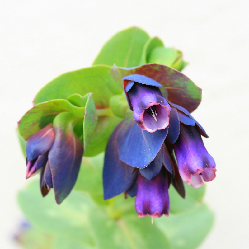 本種は、園芸品種であり、親種は南ヨーロッパ原産の一年草である。 非常に特徴のある花姿をしているため、一度見ればなかなか忘れられない花である。 垂れ下がって咲いている青紫色の花弁のように見えるのは萼である。 花弁は筒状で、花色は青紫、黄色などがある。 ケリンテ属は、ヨーロッパ、地中海沿岸地域に10種がある。 [ 引用 : 園芸植物大事典 ( 塚本洋太郎総監修:小学館発行 )]
