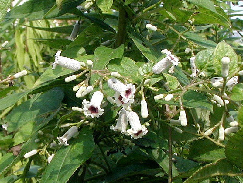 茎はつる性で右巻きで数mになる。葉は対生し長卵形で変異が大きい。