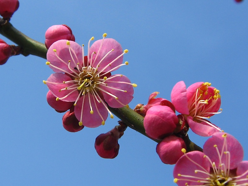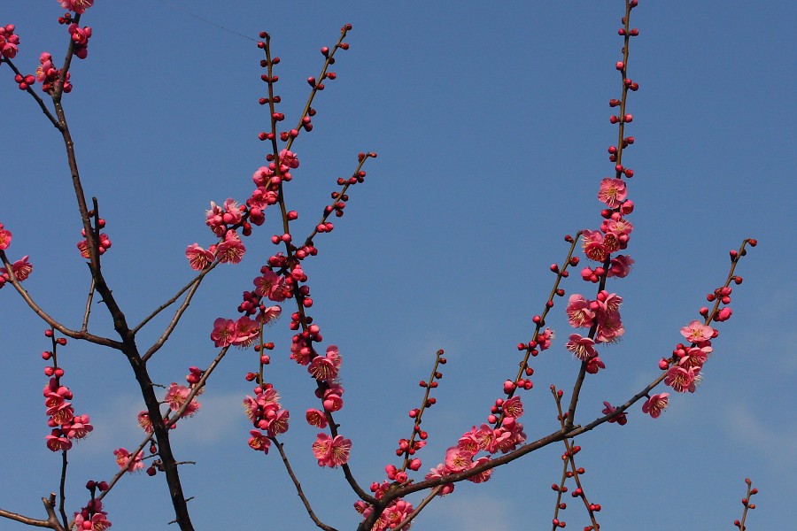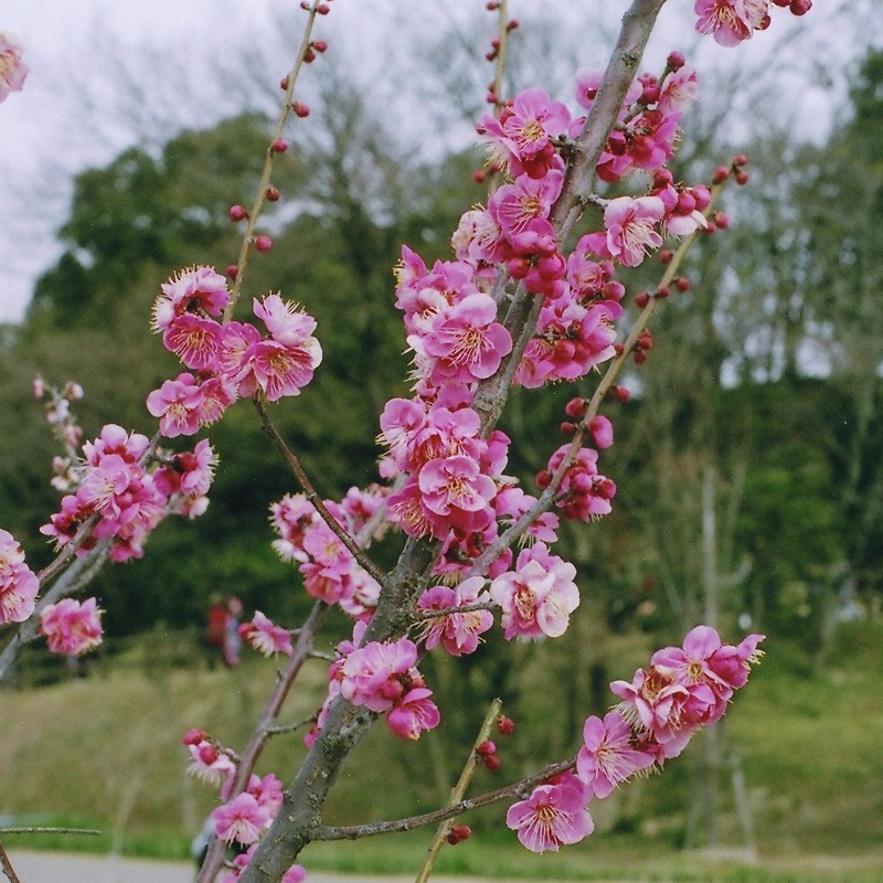 ミチシルベは、豊後系の花梅品種である。 花は紅色の一重咲きで、大輪である。 昔、街道などに植えられ、旅人の道標になったことから、 この名がついたといわれている。 花弁は5枚で、雄しべは多数である。 花弁がきれいな円形である。
