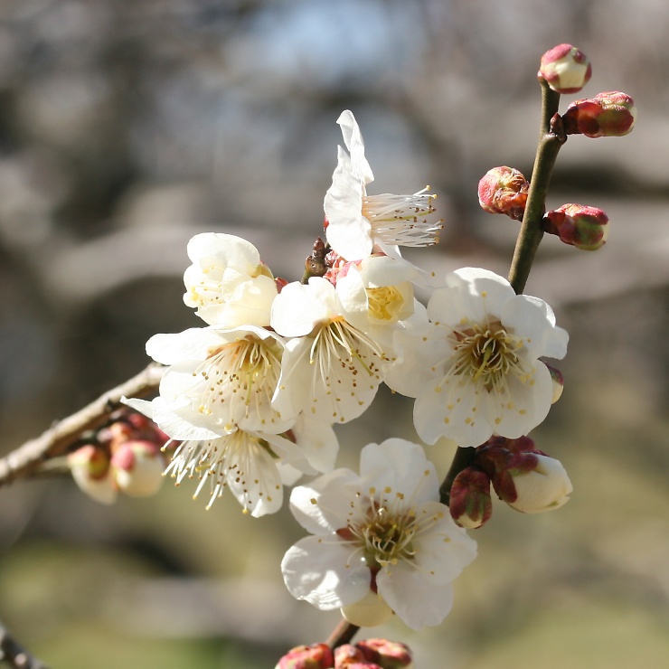 ゲンジサラサは、花弁が丸く、花つきが良好である。 古木になると赤色花のみとなることもある。 花は白地にピンクの絞りが入る一重咲きで、中輪である。 花弁は5枚で、雄しべは多数で、葯は黄~茶褐色である。 [ 引用 : 愛知県植木センター梅園名板 ]