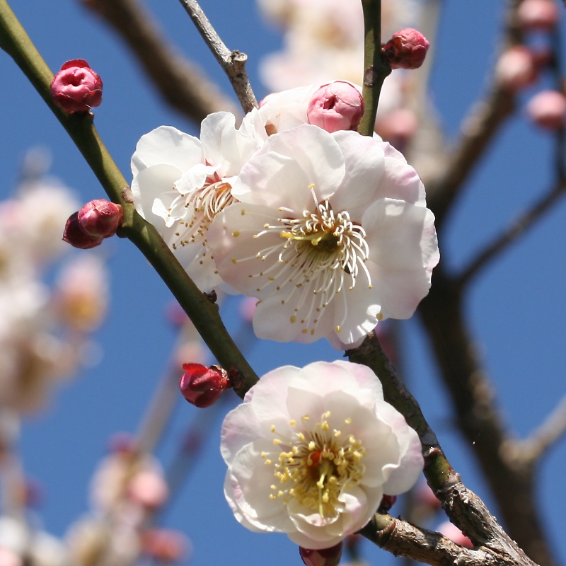 ミヤコニシキは、花弁は大きく波打ち、 雄しべは細長く揃いもよい。 ときに紅白咲きわける。盆栽に適する品種である。 開花時期は、1月中旬~2月上旬である。 花は淡い裏紅色の八重咲きで、大輪である。 花弁、雄しべともに多数で、葯は黄色である。 [ 引用 : 愛知県植木センター梅園名板 ]