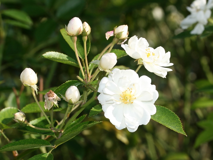 グルメ・ポップコーンは、小輪の白花が房状に咲く四季咲き品種である。