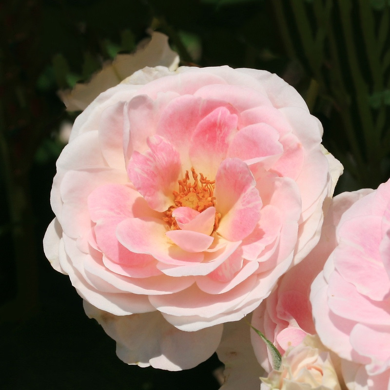 春の舞は、微香の四季咲きで、八重で花径 5~7㎝ の中輪である。 花形は丸弁平咲きで、花色は中心が赤みがかった淡桃色で、 外側ほど白色で、房状に咲く。 (花色は青みがかった淡桃色のこともある) 樹形は木立性で、樹高は、1.2~1.5m 程度である。
