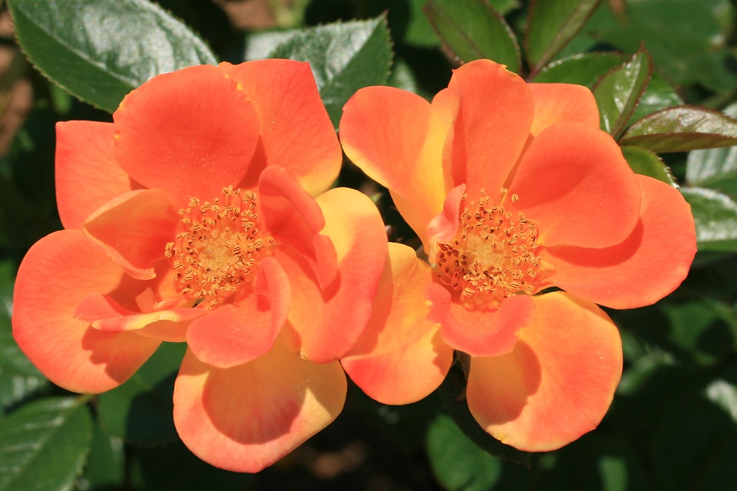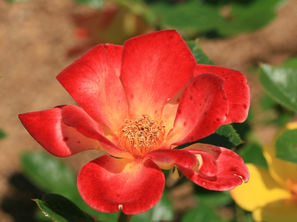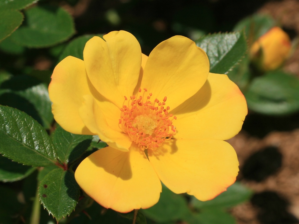 ミスターJCBは、四季咲きで、一重の中輪である。 花形は丸弁平咲きで、花色は黄色から橙色・赤色へと変化する。 樹形は木立性で、樹高は、1.0~1.2m 程度である。 本種は、花が咲き進むにつれて、2枚目(左)のように黄色から、 3枚目(左下)のようにだんだん橙色に変わり、 さらに咲き進むと、4枚目(左下二)のように赤色になる。