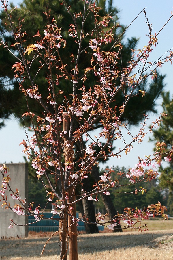 MEMO: 植栽4年目の大寒桜は、満開でもこの程度の花姿である