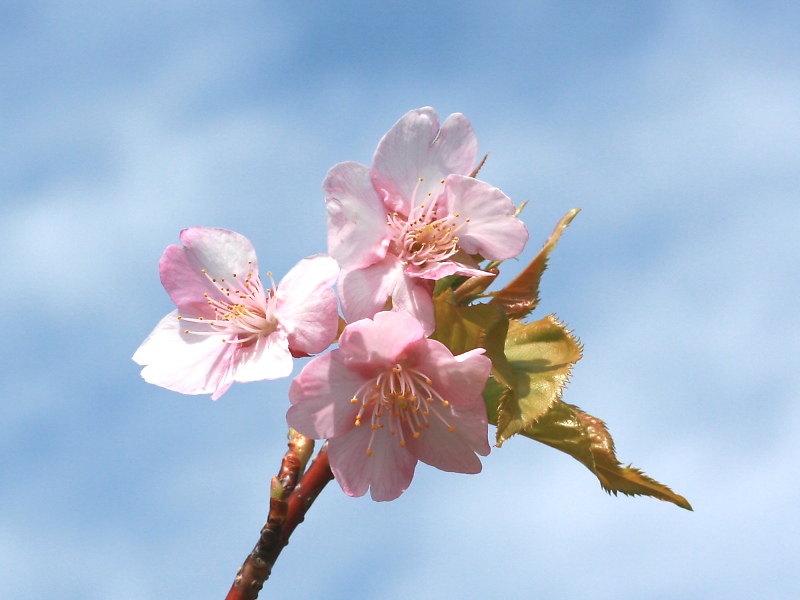 葉が出始めた河津桜で、満開時には花と葉が混在する