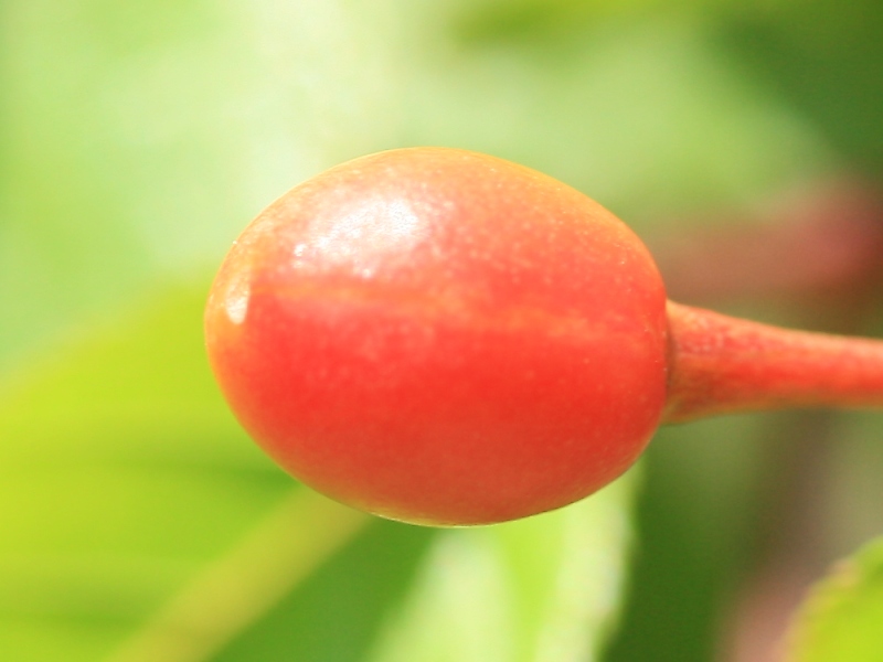MEMO: 熟した寒桜の果実で、長さ×幅:11×9mmと大きく、 橙がかった赤色に熟して柄まで赤いが、寒桜は少し結実する品種である