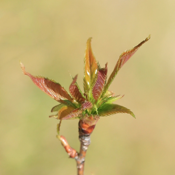 菊枝垂は蕾より一足早く茶色の若葉が出てくる