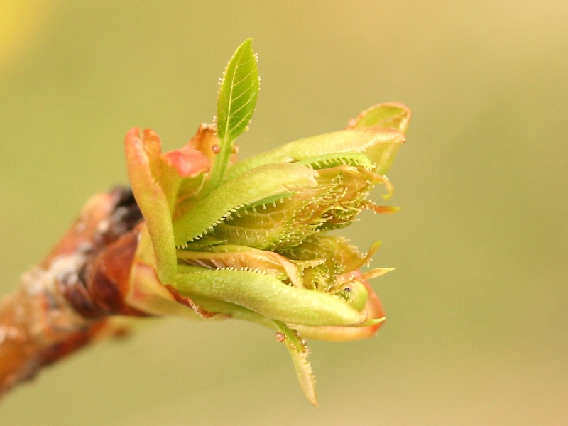 冬芽から若葉が出てきたところ、蕾より先に葉が出る
