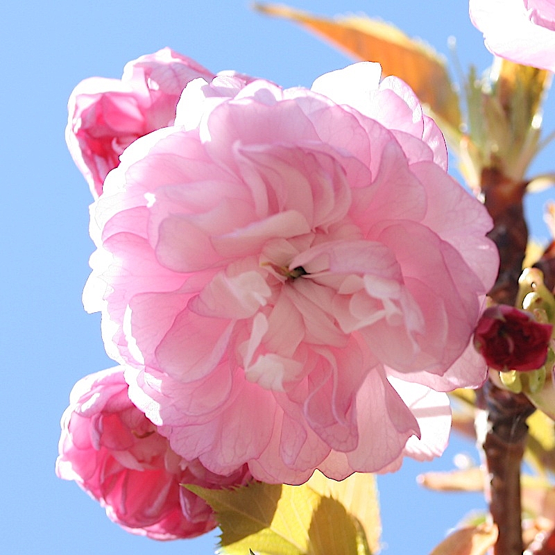 MEMO: 開花した紅華で、花弁は紅色で、八重咲きの大輪である。 花の中心部に葉化した雌しべが見える