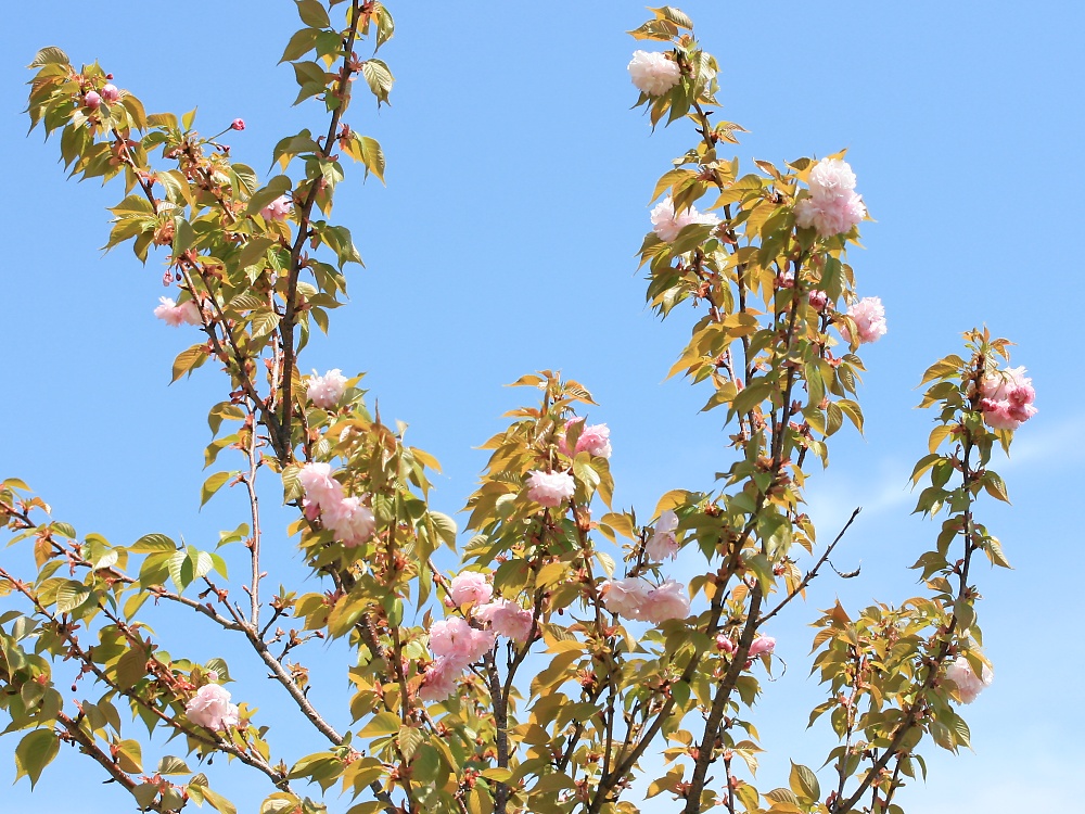 MEMO: 5分咲きの紅華であるが、若木のため花はまばらにしか付かない。 八重咲き種のため、開花期間が長く、長く楽しめる花である