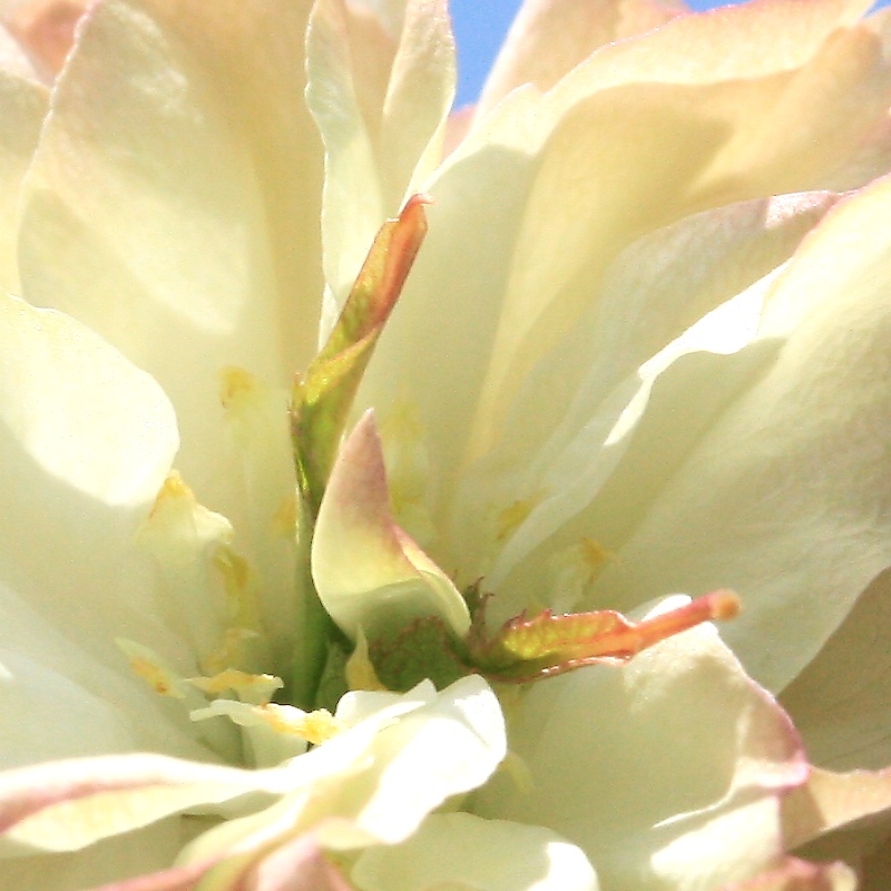 MEMO: 開花後の須磨浦普賢象の中心部で、2個の葉化雌しべの中から嘴状 の花弁が出始めたところで、このように花の中に花が咲くのを二段咲きという