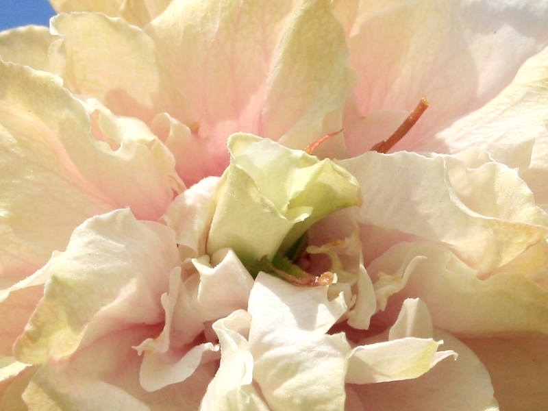 MEMO: 二段咲きの須磨浦普賢象で、中心の葉化雌しべから出た円筒状の 花弁がこれから開いて二段目の花が咲くところである。なお、 須磨浦普賢象に付く全ての花が二段咲きになるわけではない