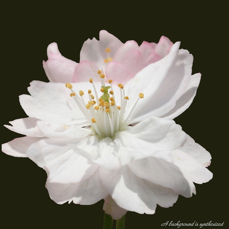 MEMO: 開花した奈良の八重桜で、初めて見る花であり、興味津々である 花弁は白色ないし淡紅色で、八重の中輪で、雌しべが2本ある