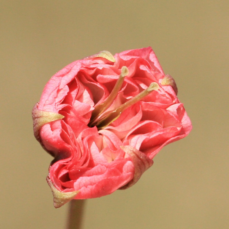 MEMO: 蕾の先が大きく開き開花が間近になってきたところで、 蕾の中心部に2個の葉化雌しべが確認できる。