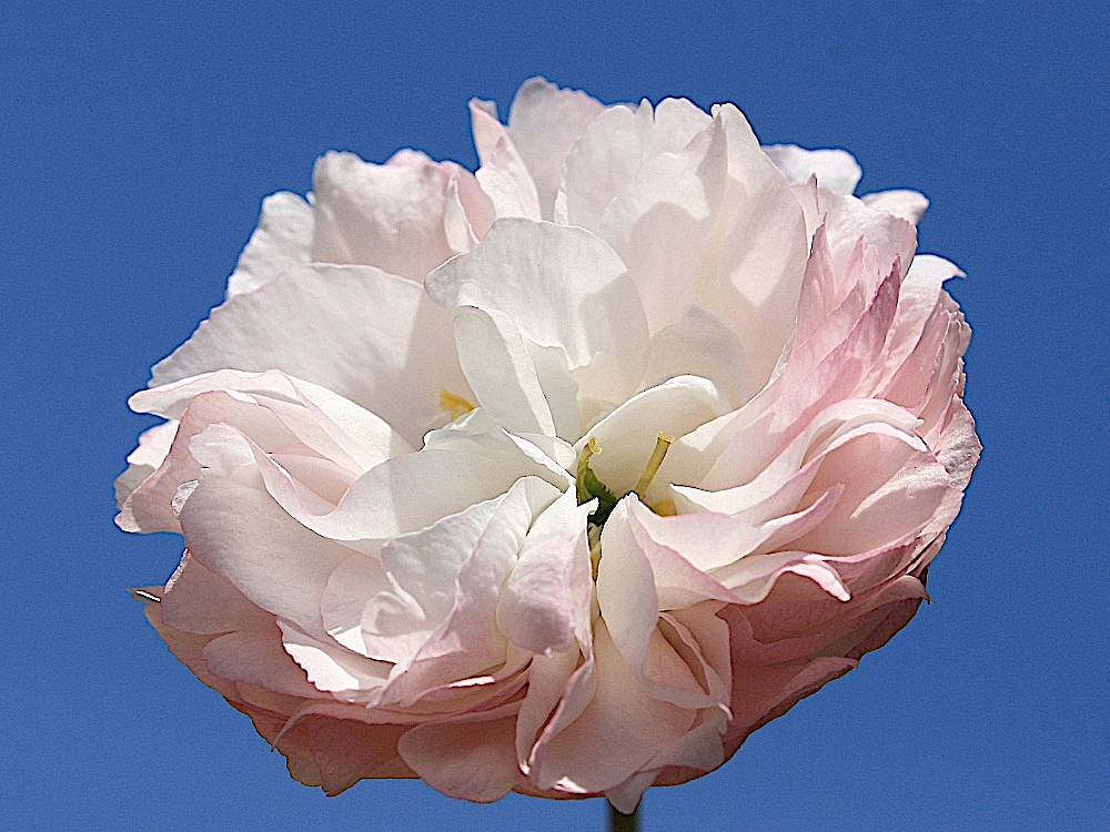 MEMO: 開花した普賢象で、花色は淡紅色から淡灰白色で、八重の大輪で、 花の中心部に2個の葉化雌しべが確認できる。