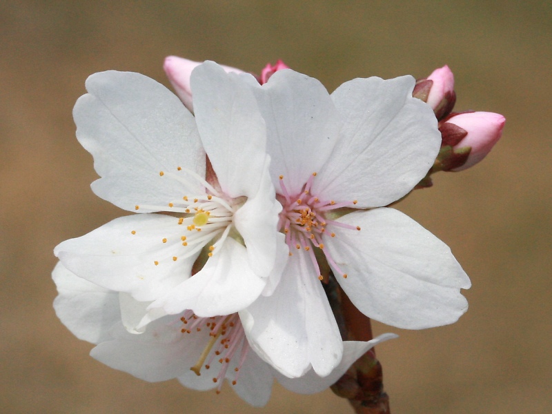 MEMO: 開花した冬桜で、左は咲いた直後、右は咲いて時間が経過した花で、 時間とともに花の中心が赤みを帯びてくるのが特徴である
