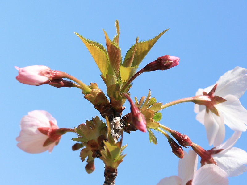 MEMO: 豆桜は、満開頃から緑がかった茶色の若葉が出始める