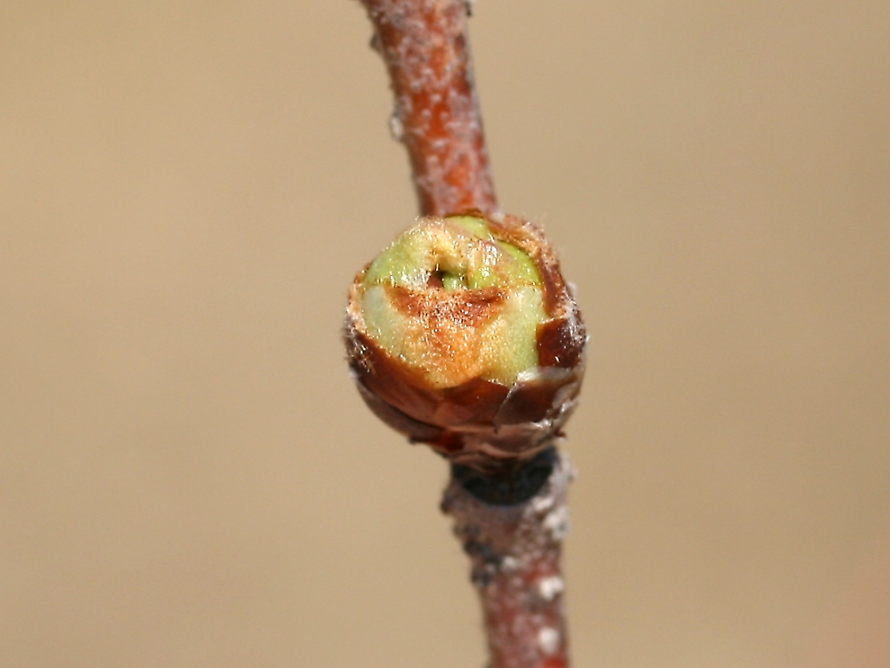 MEMO: 膨らみが増したアーコレードの冬芽で、先端に黄緑色がはっきり と見えており、その中心が割れ、この先おそらくつぼみが出てくると思われる