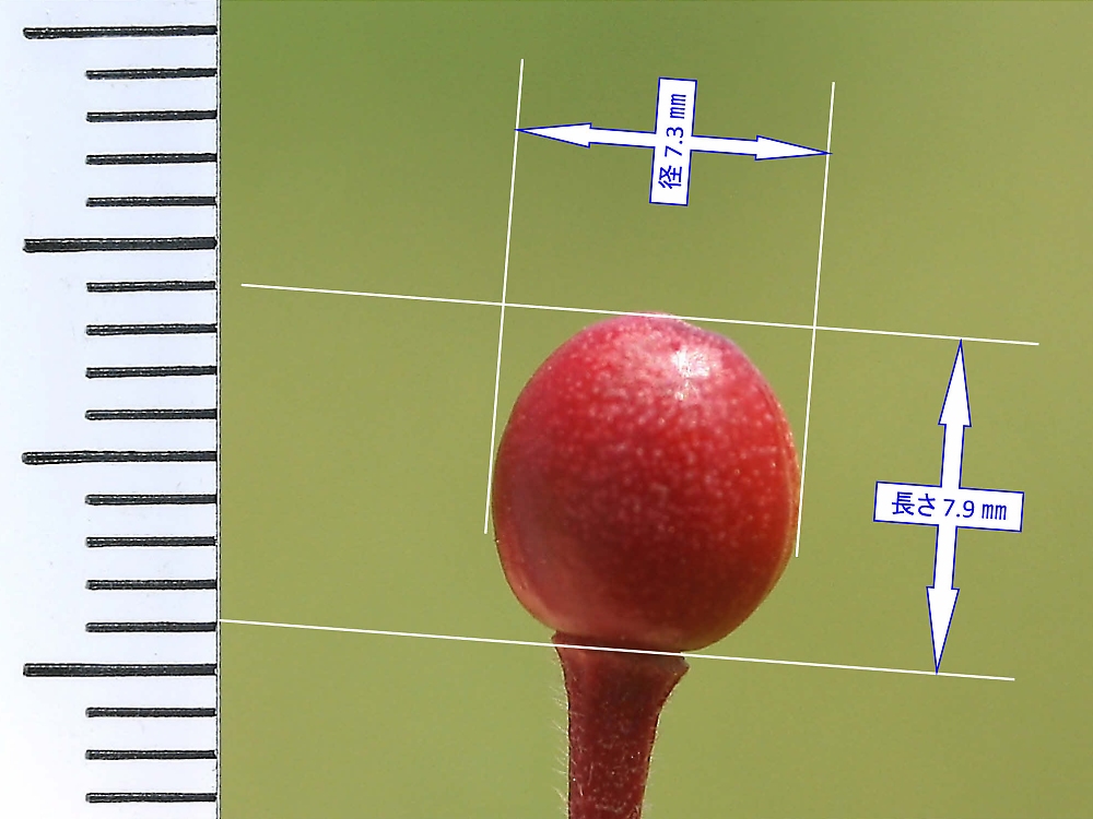 MEMO: アーコレードの実で、長さが 7.9 ㎜で、径が 7.3 ㎜(長さの92%)と ほぼ球形であり、実全体が真っ赤になっており、熟し中である