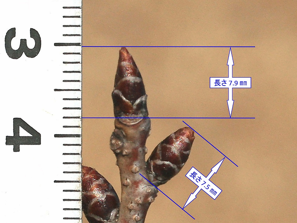 MEMO: 嵐山の冬芽で、長卵形および円錐形で、長さ 7.5 ~ 7.9 ㎜と長い芽 であり、芽鱗(がりん:葉または花になる芽を覆って保護するうろこ状の小片) の縁が白く縁取られ、開花時期は4月中旬~下旬のため、全く堅い状態である