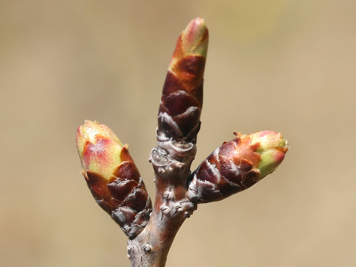 MEMO: 膨らみが更に増した嵐山の冬芽で、先端の淡紅色の部分も長くなり、 まもなくつぼみや葉が出始めるところで、両側はつぼみが出る花芽と思われる