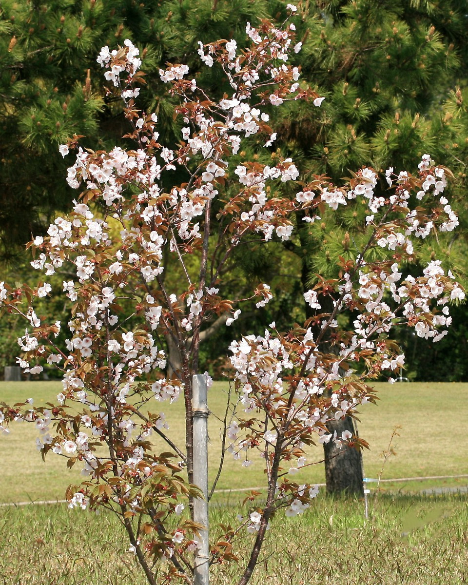 MEMO: 満開を迎えた嵐山で、若木であるが 今年は花付きが良く、茶褐色の葉との饗宴である