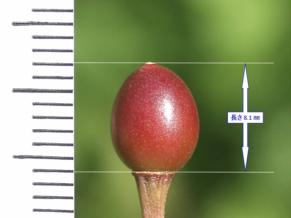 MEMO: 嵐山の実の長さで、長さ 8.1 ㎜とやや大きい実で、もう、実が赤く なってきており熟し始めてきたところで、この先どこまで熟すか楽しみである