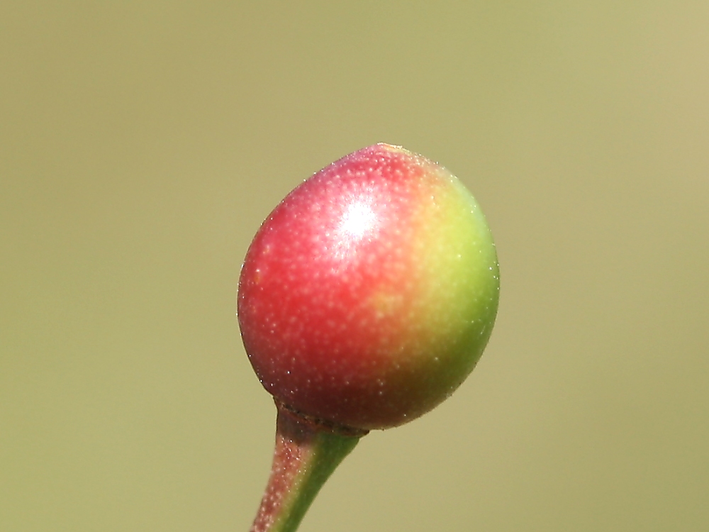 MEMO: 嵐山の実で、1週間前より益々丸くなってきており、陽の当たらない 面(右側)はまだ緑色であるがもう、実が赤くなっており熟し始めてきたところ