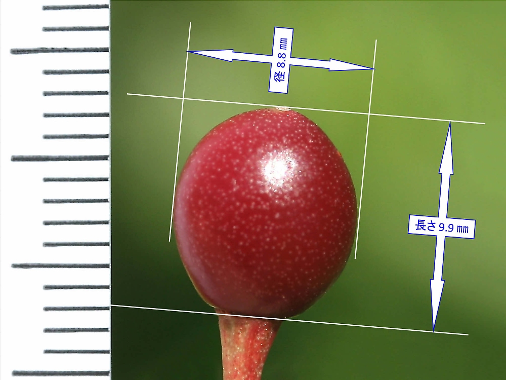 MEMO: 嵐山の実の大きさで、長さが 9.9 ㎜で、径が 8.8 ㎜(長さの89%)と、 ほぼ球形で完熟に向けて熟し中であるが、完熟するまでに落下しないか心配である