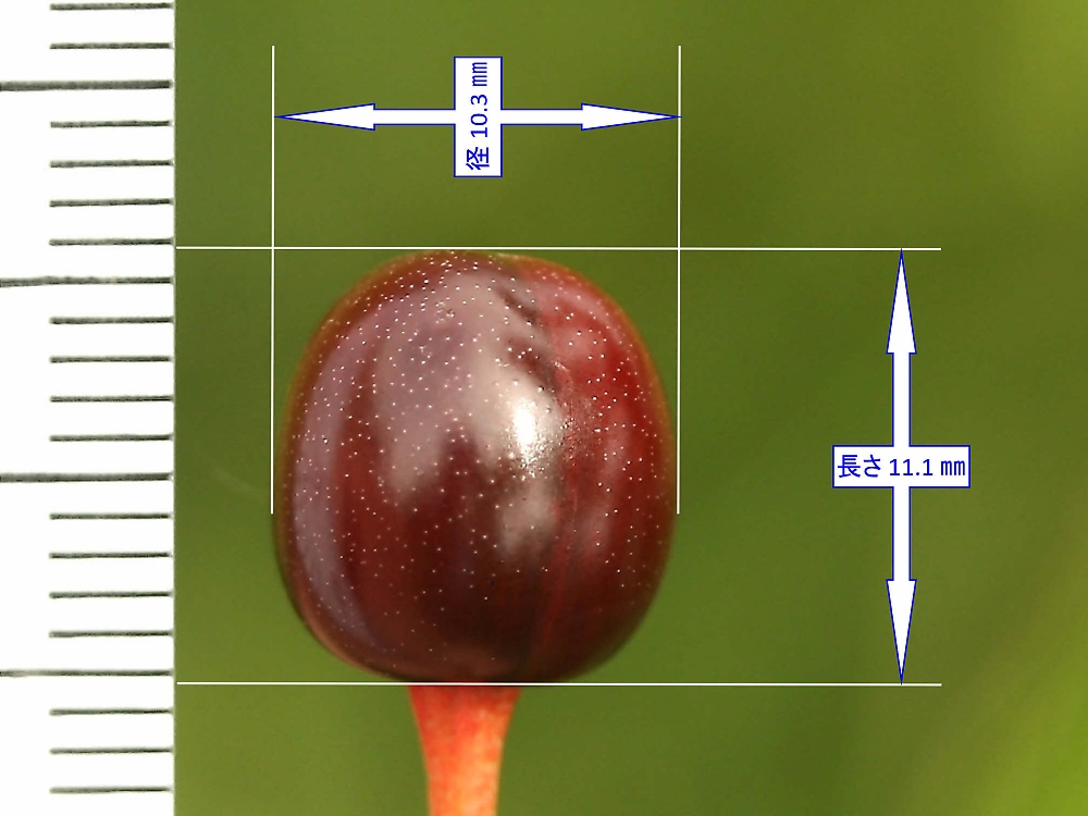MEMO: 嵐山の実の大きさで、長さが 11.1 ㎜で、径が 10.3 ㎜(長さの93%) と、ひと回り大きくなり、完熟(黒熟)間近であり、完熟実が見れそうである