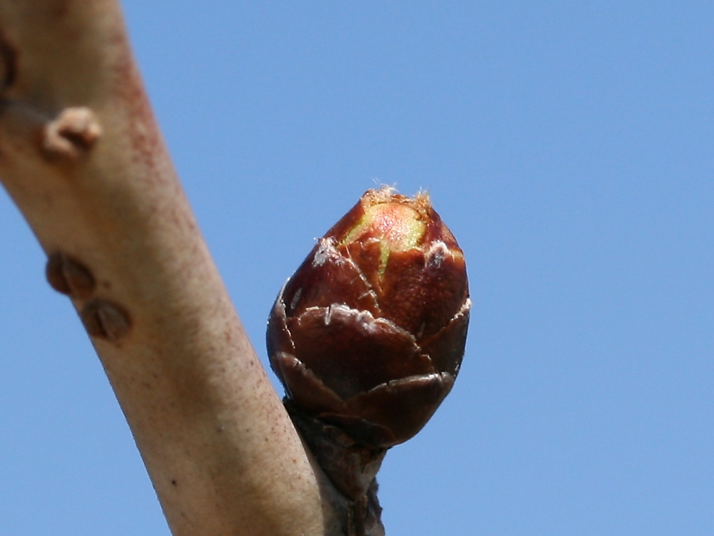 MEMO: 膨らみ始めた有明の冬芽で、長卵形の冬芽が丸みを 帯び、芽の先端が割れ淡紅色や淡黄緑色が見え始めてきたところ