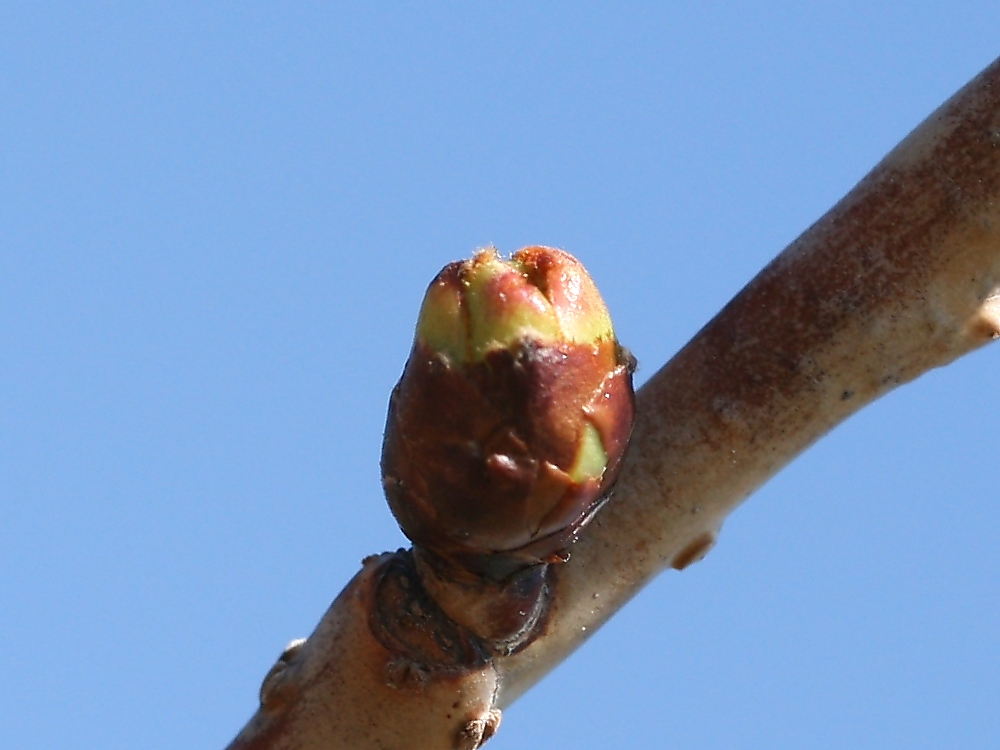 MEMO: 膨らみが更に増した有明の冬芽(花芽)で、先端が 割れ、つぼみらしきものが顔を覗かし始めたところ