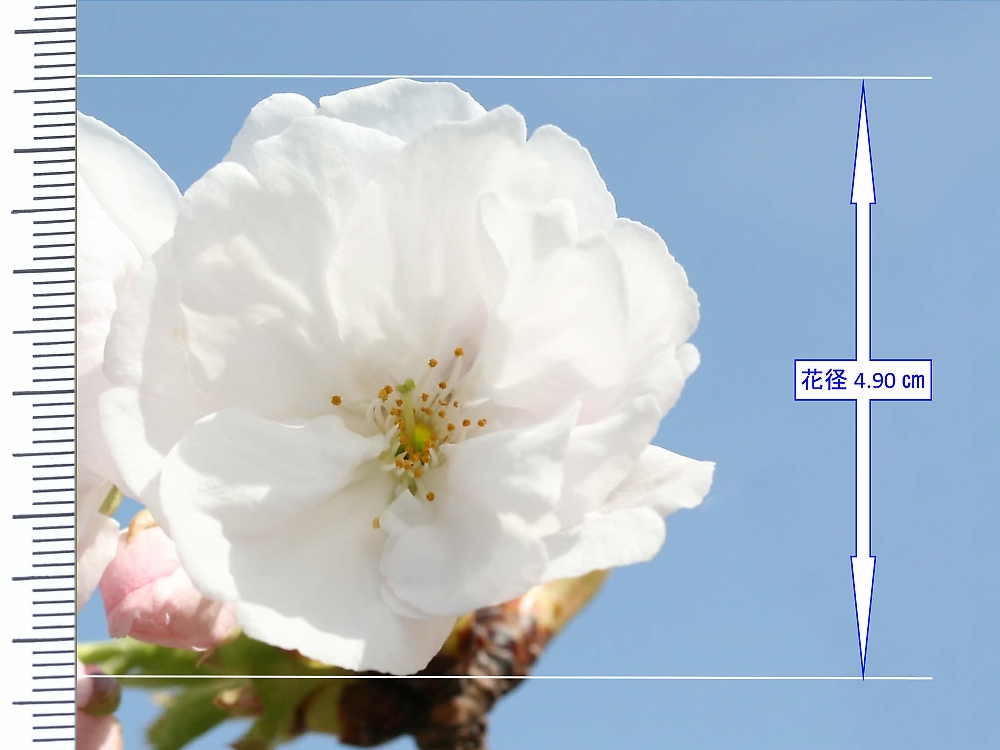 MEMO: 有明の花の直径で、花径は 4.9 ㎝と大輪であり、 半八重で花弁が大きく波打ちにぎやかさが有る花である