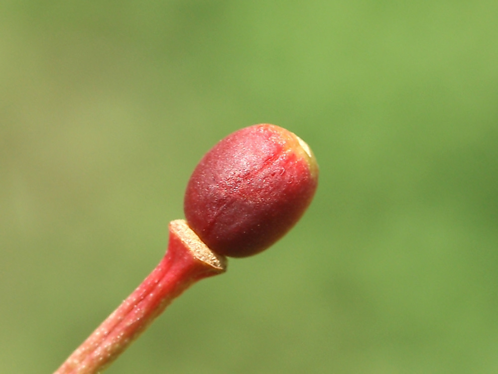 MEMO: 結実から約2週間後のの有明の実で、暗紅色になっており、 色としては熟した色であるが、先端がわずかに淡茶色になっており、 おそらくこの後は落果するものと思われ、残念ながら完熟には至らない