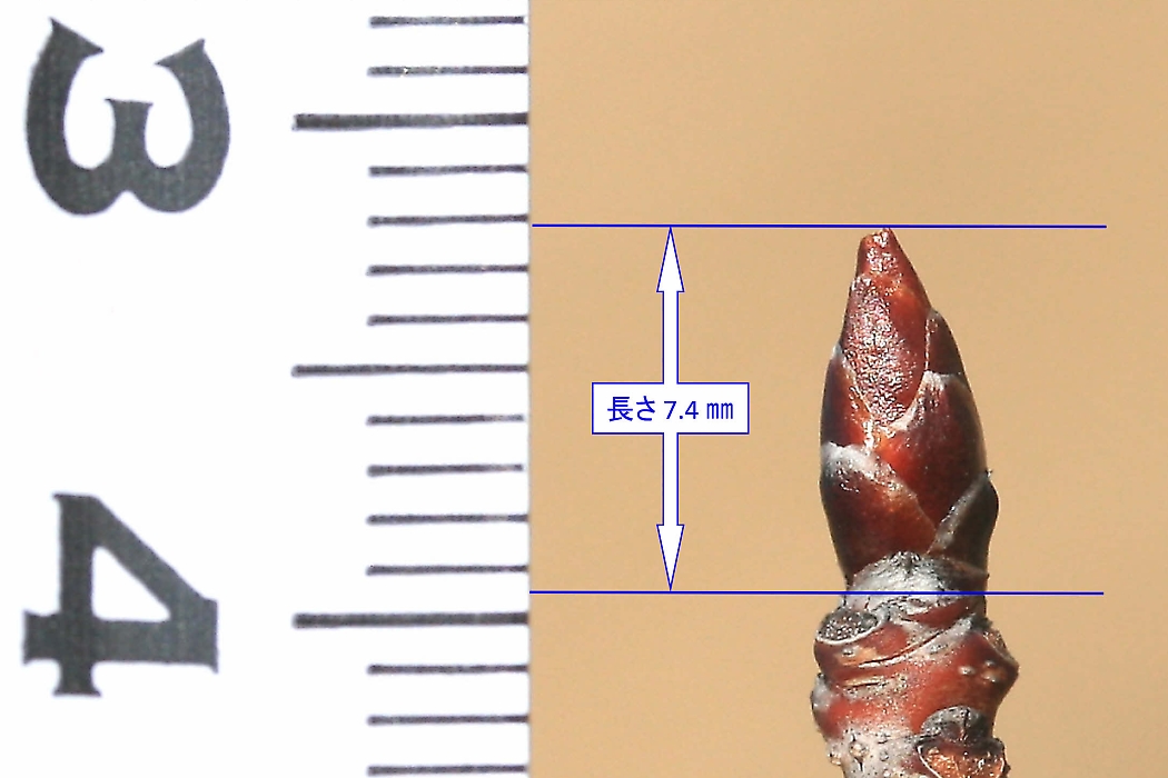 MEMO: イチヨウの冬芽で、砲弾形で、長さ 7.4 ㎜と普通の長さの品種であり、 下段の芽鱗(がりん:葉または花になる芽を覆って保護するうろこ状の小片)の縁が 白く縁取られており、開花時期が4月中旬~下旬であるため、まだ堅い状態である