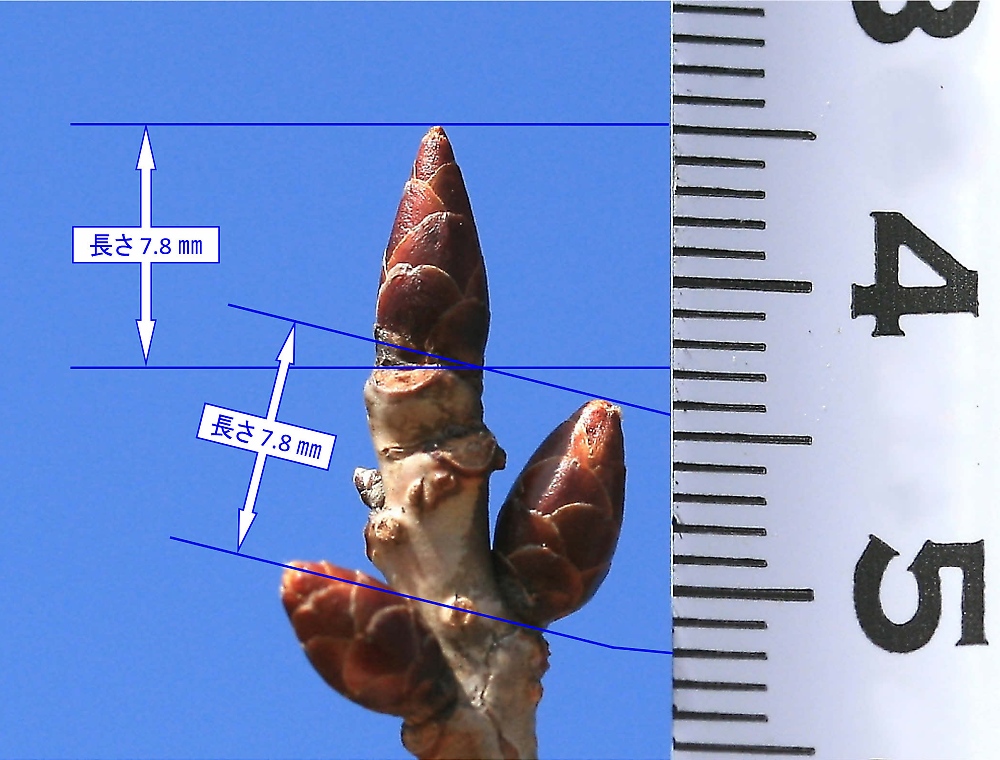 MEMO: 右近の冬芽で、円錐形および長卵形で、長さ 7.8 ㎜と普通の長さ の品種であり、開花時期が4月中旬~下旬であるため、まだ堅い状態である