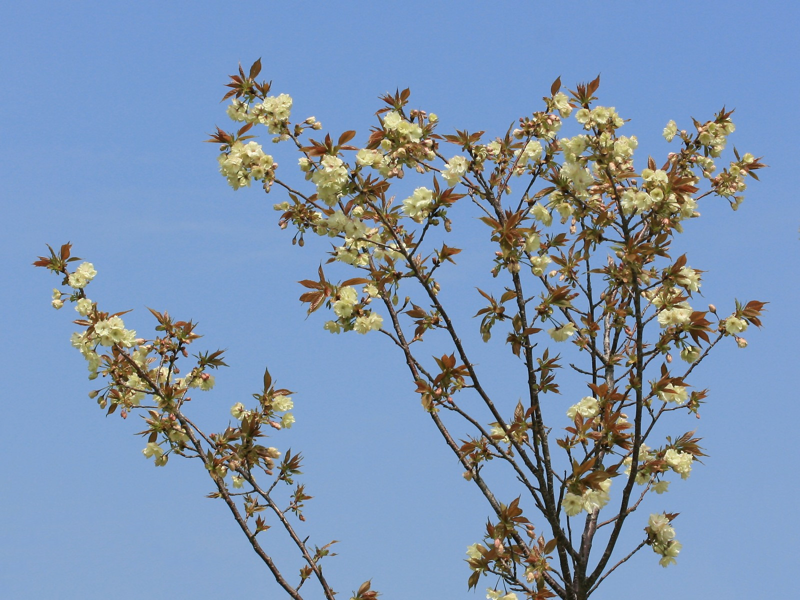 MEMO: 7分咲きの右近で、まだ、若木のため花はまばらにしか 咲いていないが、黄緑色の花はとても珍しく見ごたえのある品種である