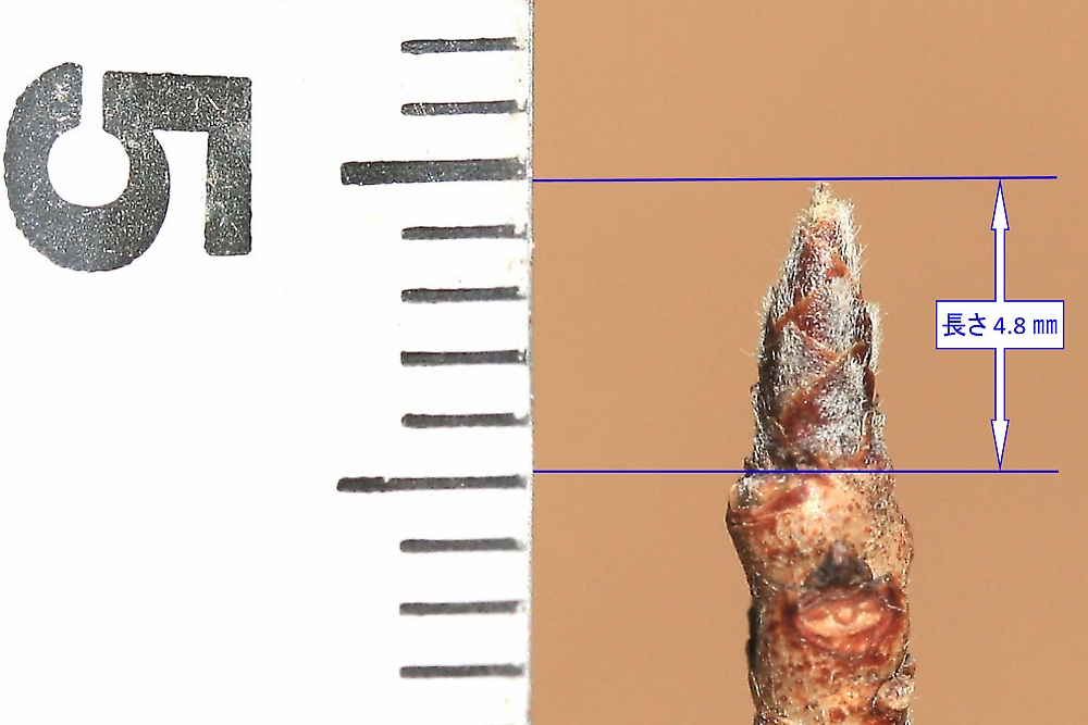 MEMO: 江戸彼岸の冬芽で、円錐形で、長さ 4.8 ㎜と短く小さい芽であり、 全体に短毛を多く有し、開花時期が3~4月であるため、全く堅い状態である
