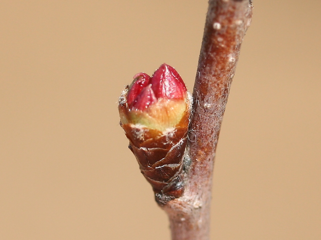 MEMO: 江戸彼岸の冬芽で膨らみが増し、先端が割れ紅色のつぼみが 顔を出し始めたところで、画像では大きく見えるが実物は非常に小さい