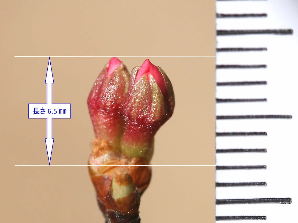 MEMO: 出始めた江戸彼岸のつぼみであるが、画像では今一歩実際の大きさが わからないので計測した。長さは 6.5 ㎜と1㎝にも満たない小さいつぼみである