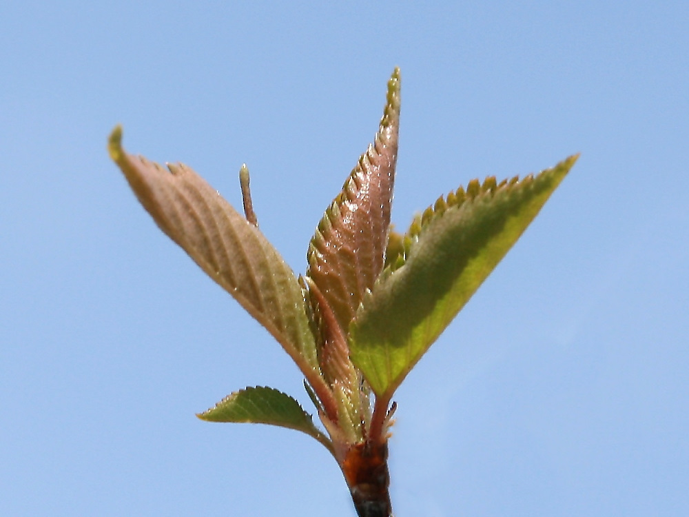 MEMO: 葉が出始めた江戸彼岸で、満開を過ぎた頃から茶色や黄緑色の若葉が出始める
