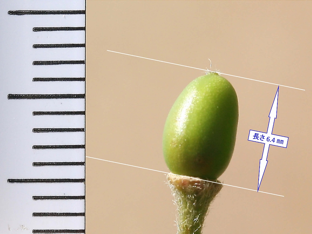 MEMO: 結実したばかりの江戸彼岸の実の長さで、長さ 6.4 ㎜とまだ 小さい状態で、この先、どのように成長していくのかが楽しみである