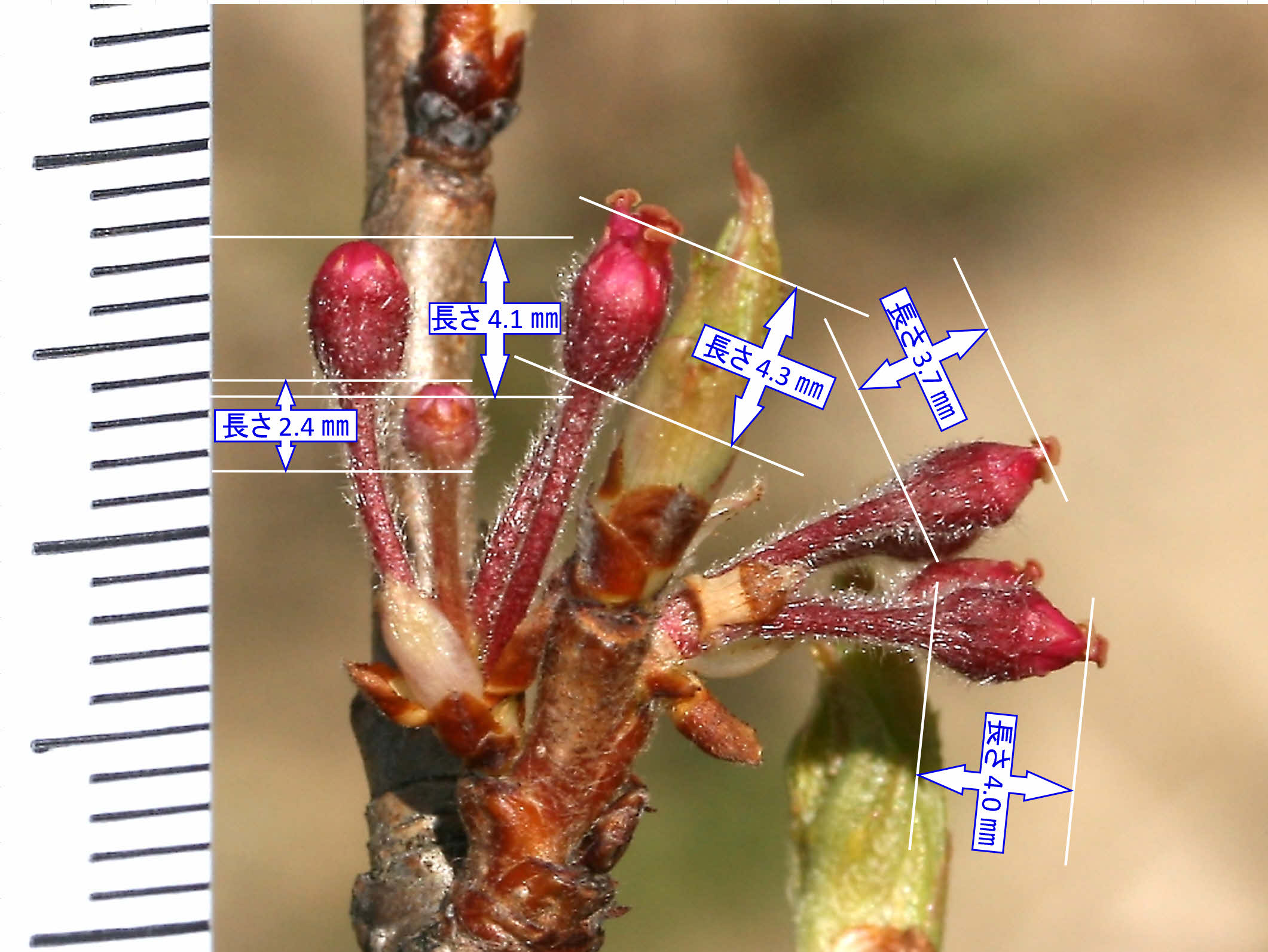 MEMO: 八重紅枝垂のつぼみであるが、おそらく桜の中でも最も小さい つぼみと思われるもので、長さは 4 ㎜ 前後で中でも最も小さいものは、 2.4 ㎜でこのつぼみからはどのくらいの大きさの花が咲くか楽しみである