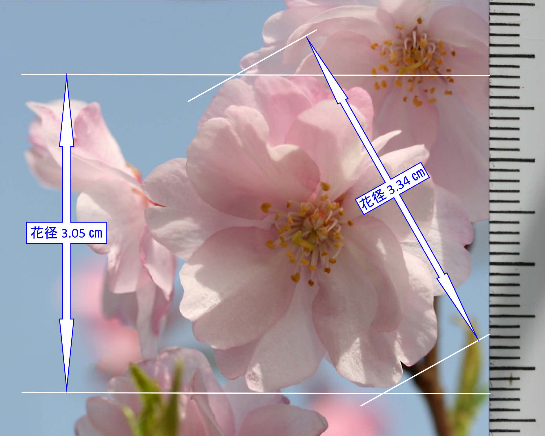 MEMO: 開花したばかりの八重紅枝垂で、花の直径は 3.0 ~ 3.5 ㎝ 程度の中輪、 枝は枝垂性で細長く、樹形は決して整った形にはならず、四方八方に枝を伸ばす