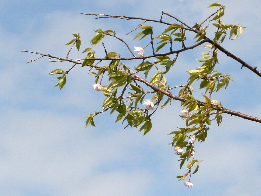 MEMO: 散り始めた八重紅枝垂で、花色がピンクから白色に変わってきている