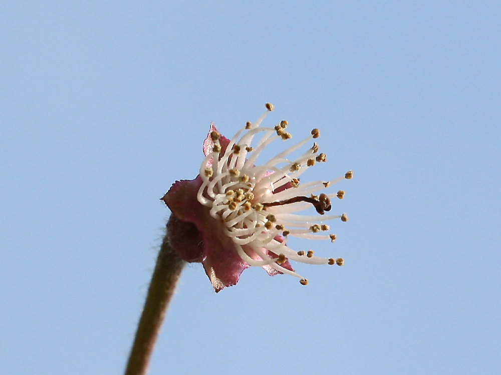 MEMO: 花期が終了した八重紅枝垂で、花弁が散り萼と雄しべだけに なった花で、この状態で雄しべが白色であるのは珍しい品種である