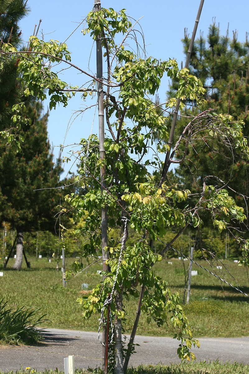 MEMO: すっかり葉桜になった八重紅枝垂で、若葉に覆われているが、 枝垂桜特有の枝ぶりが四方八方に伸びて樹形としては整っていない状態である